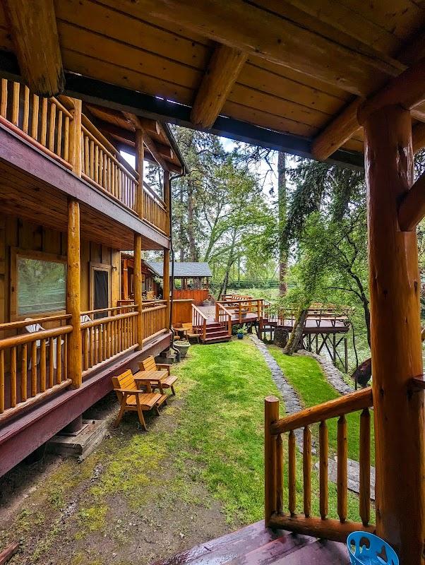 Each room at The Lindsay Lodge offers a private balcony with breathtaking views of the Applegate River and the historic Pioneer Bridge. The lodge itself is a masterpiece constructed from hand-skinned log poles of pine, fir, and redwood, exuding rustic charm and warmth.